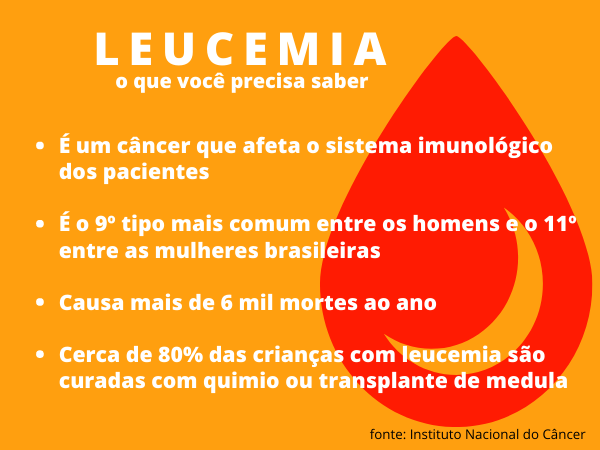 A leucemia é uma doença maligna dos glóbulos brancos, geralmente, de origem desconhecida. Tem como principal característica o acúmulo de células doentes na medula óssea, que substituem as células sanguíneas normais, de acordo com o Instituto Nacional do Câncer (Inca).